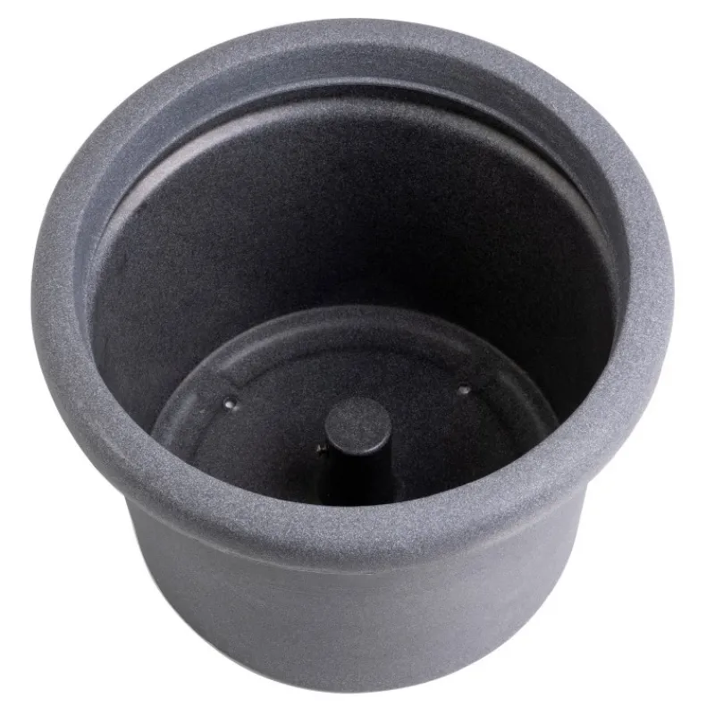Vaso tondo stampato in sistema rotazionale in PE. Basamento integrato con vite di fissaggio. Abbinabile ai modelli di fontane a colonna Aquapoint Underground TRIANGLE, TOTEM, STEELO, LOOP. Misure: Ø 40 – 29 h cm