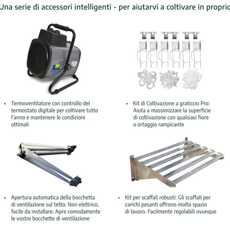 - Caratteristiche aggiuntive: Include un sistema di grondaie integrato per incanalare l’acqua piovana da usare per l’irrigazione e finestre di ventilazione manuali che aiutano il flusso d’aria, permettono di regolare i livelli di umidità, temperatura e ventilazione e vi mantengono più freschi nei giorni più caldi.