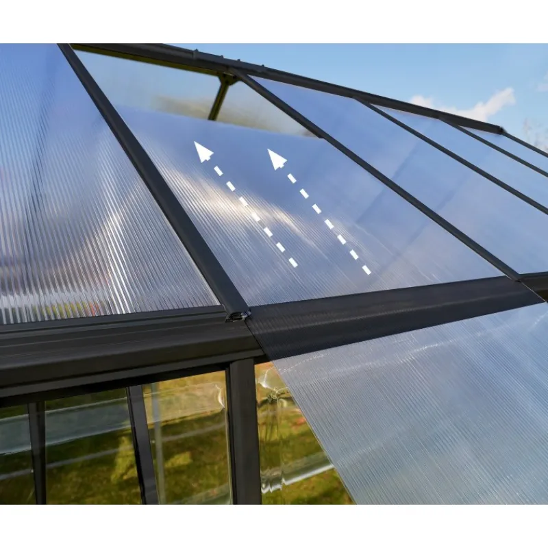 - Pannelli del tetto in policarbonato a doppia parete: I pannelli del tetto da 4 mm proteggono dalla forte esposizione alla luce solare e prolungano la stagione proteggendo le piante dalle gelate autunnali.