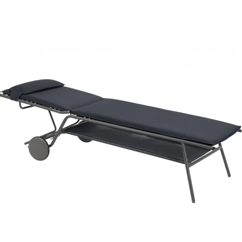 – Finiture di qualità: cuscino della poggiatesta regolabile e removibile e intonato al colore della struttura tubolare, ruote a doppia flangia.