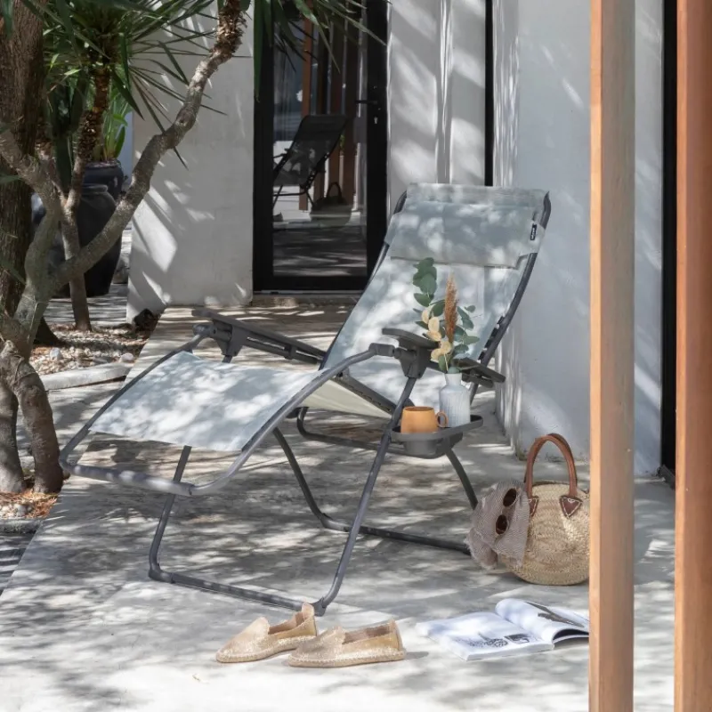 Questo modello relax è il punto di riferimento in materia di relax, poiché è stato concepito per offrire la posizione ideale per rilassarsi. Il principio è il posizionamento delle gambe leggermente più alte del livello del cuore per un riposo ottimale. Potrete cambiare posizione molto facilmente in base alle vostre esigenze e alzarvi senza alcuna fatica: i braccioli rimangono fissi, il che permette di avere un buon appoggio quando ci si vuole alzare dalla propria sdraio. Lo schienale ergonomico offre un comfort equilibrato e un buon sostegno della schiena grazie ai fissaggi con clip che arrivano fino all’altezza delle spalle. Questa sdraio-poltrona confortevole e facile da pulire trova facilmente posto in giardino o a bordo piscina.