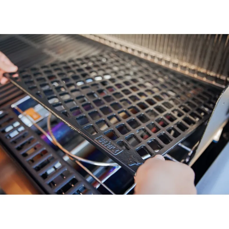 L’ampia superficie consente di realizzare le amate striature della griglia anche su grandi pezzi di carne. Utilizzabile sui due lati, per grigliare la carne da un lato e le pietanze delicate sull’altro.